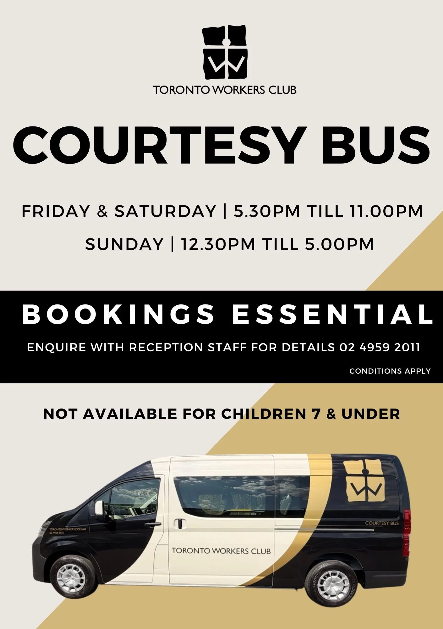 Courtesy Bus FRIDAY & SATURDAY 5.30 TILL 11.00PMSUNDAY 12.30PM TILL 5.00PMPlease call 02 4959 2011 to book